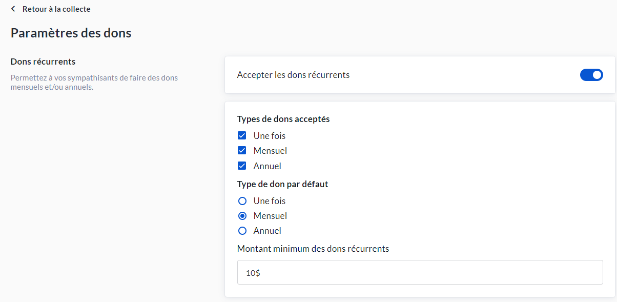 Si les dons mensuels et annuels ne sont pas personnalisés, ils utiliseront les paramètres des dons uniques.
